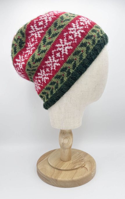This handmade knitted hat features a vibrant array of colorful geometric shapes. The hat showcases a variety of patterns all interwoven in a lively palette of bold, contrasting colors. Crafted with meticulous attention to detail, the hat offers both warmth and a playful, stylish aesthetic, making it a unique and eye-catching accessory. The intricate geometric design highlights the skill and creativity involved in its creation, perfect for adding a pop of color to any winter outfit.